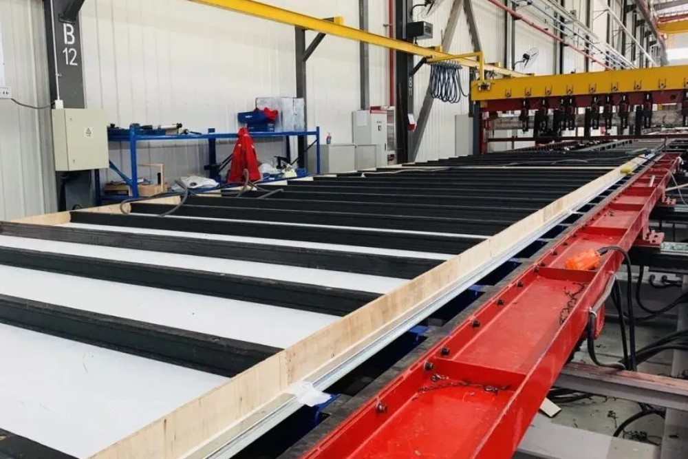 The aluminum floor is seamless in lengthwise direction; in widthwise direction, eight welding machines operate synchronously for one-piece integral forming.